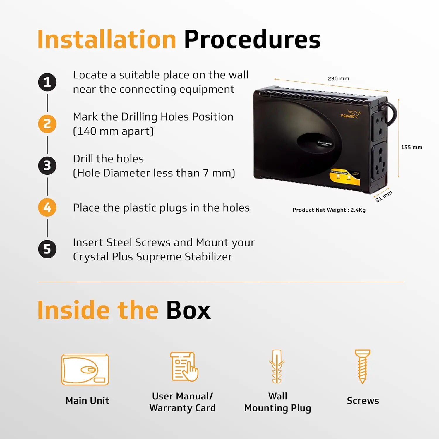 Suitable for TVs up to 140 cm (55"): Crystal Plus Supreme TV stabilizer is designed to accommodate TVs up to 140 cm (55") in size. Whether you have a compact TV or a large screen, Crystal Plus Supreme provides the ideal power protection solution